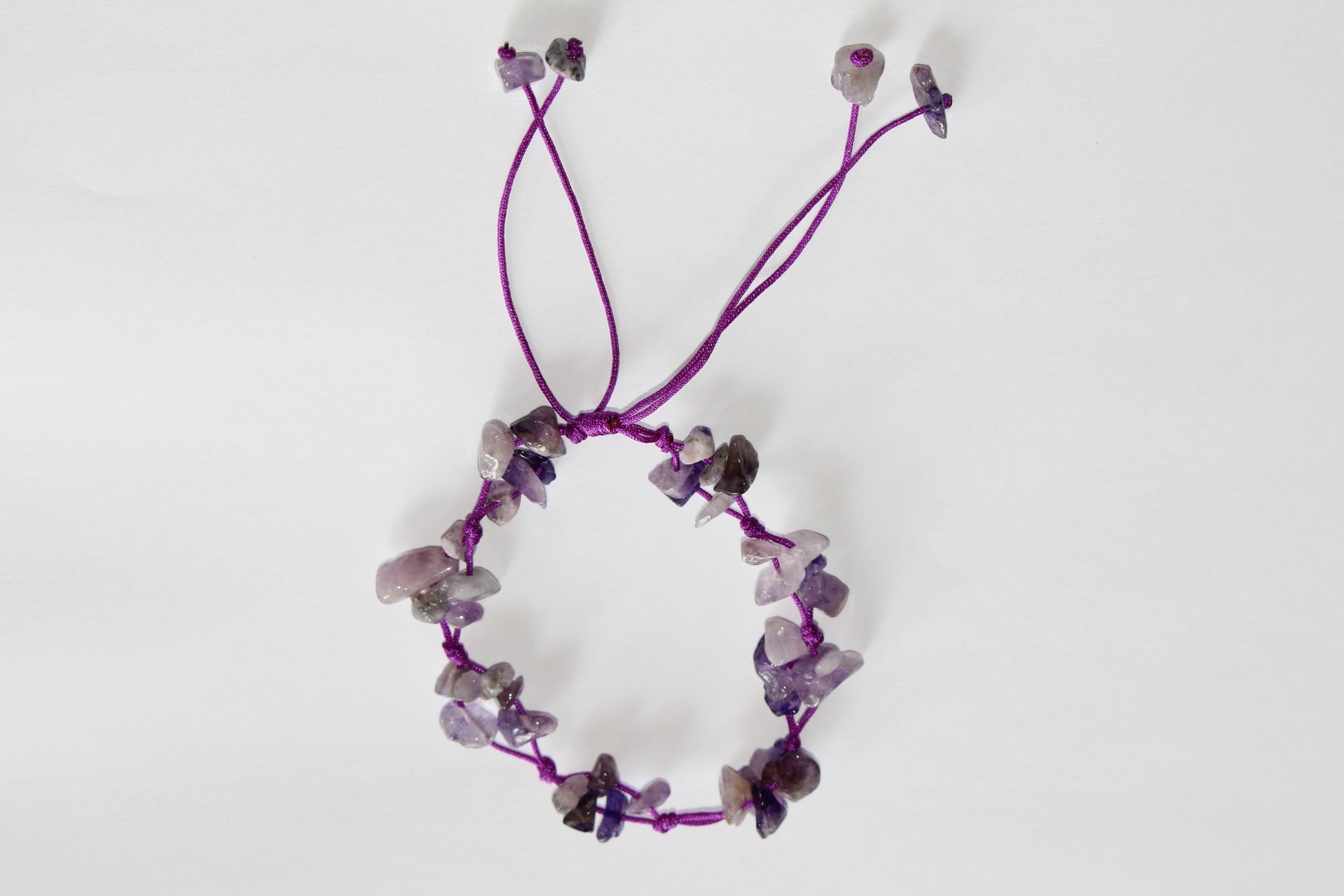 Bracelet en Améthyste, pierre qui procure beaucoup d'énergie de paix, de détente et de sérénité. Elle peut être conseillée aux personnes qui ont tendance à stresser.