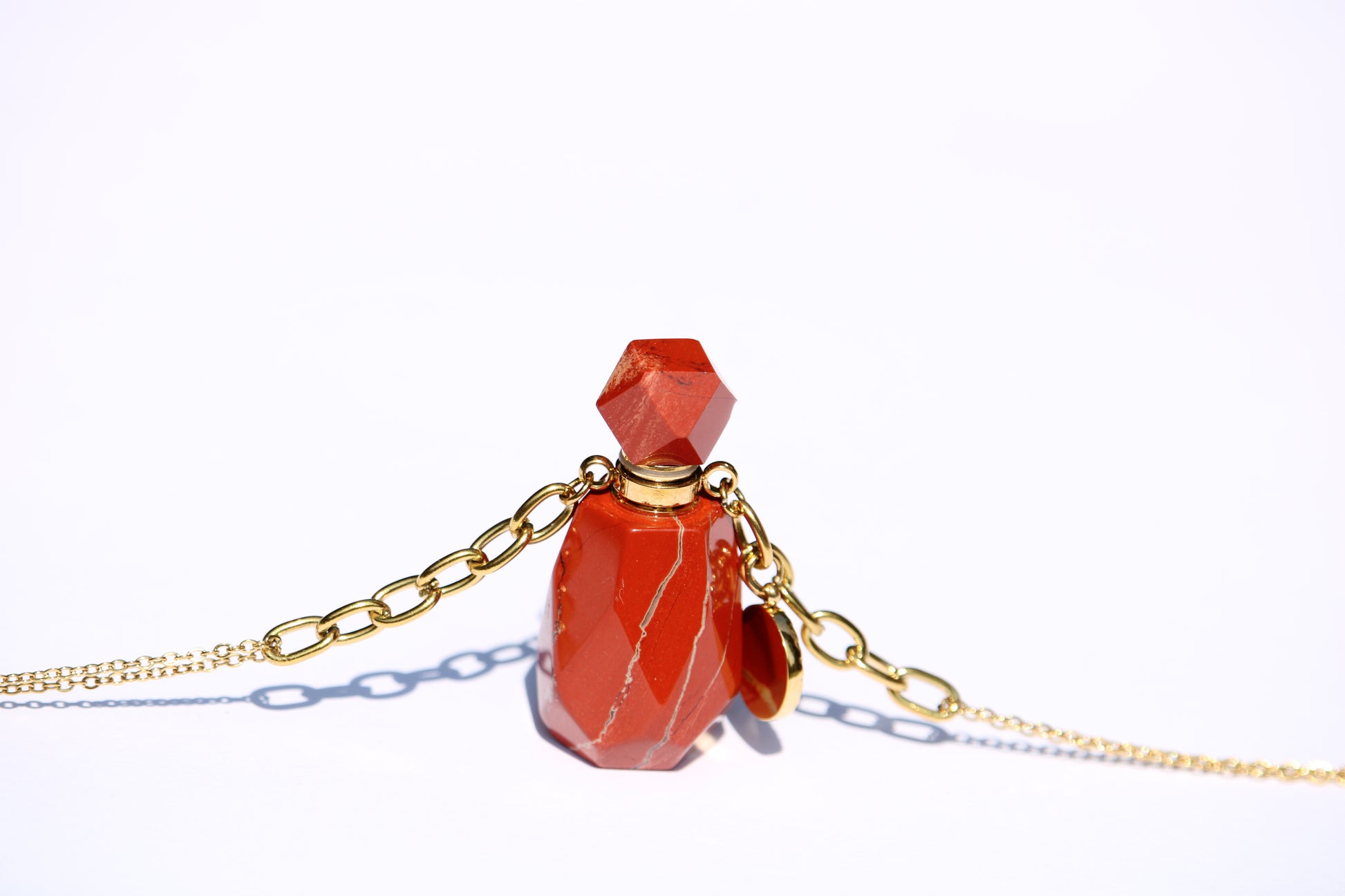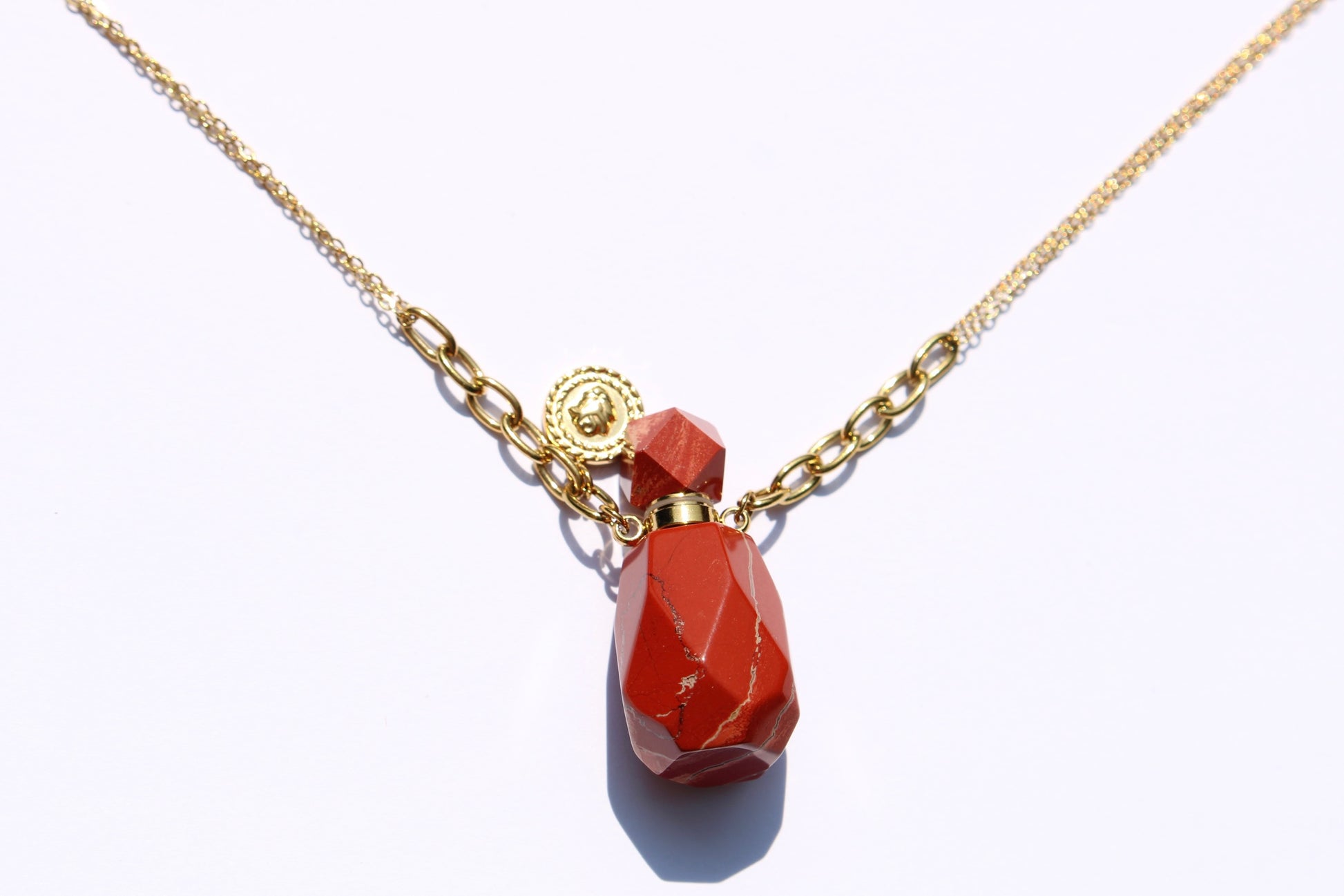 Magnifique collier en fiole de Jaspe Rouge et en acier inoxydable.