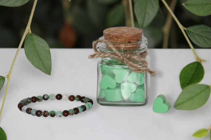 Offrez-vous ou offrez à une personne qui vous est chère ces petits fondants en cœur dorés au parfum de Grasse sans CMR de Pomme et de Cannelle avec son Bracelet en Chrysoprase.