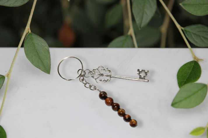 Joli porte-clés en pierres naturelles d’Oeil de tigre, pierre de protection, elle agira comme un bouclier en renvoyant les énergies négatives à son émetteur.